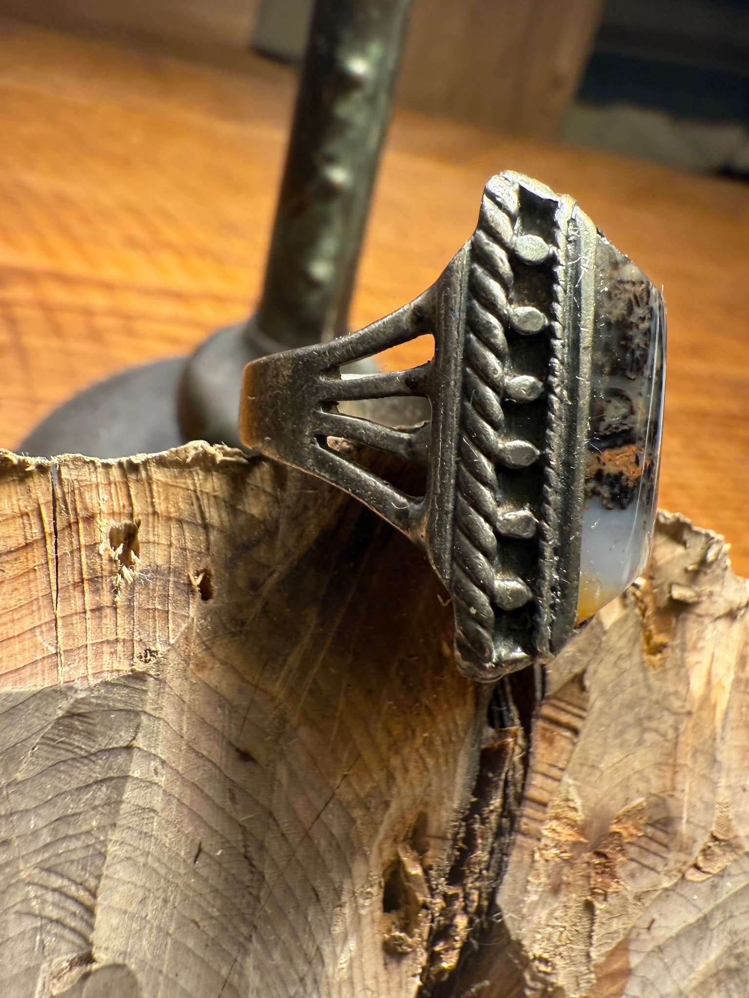Mysterious variated agate stone in a rectangular shape, set in sterling silver. Featuring a dimensional frame with sculpted edging and a strong silhouette that shows off the agate’s natural variation (smoky grays, inky inclusions, and warm amber tones).