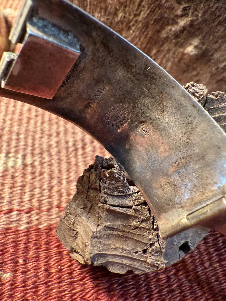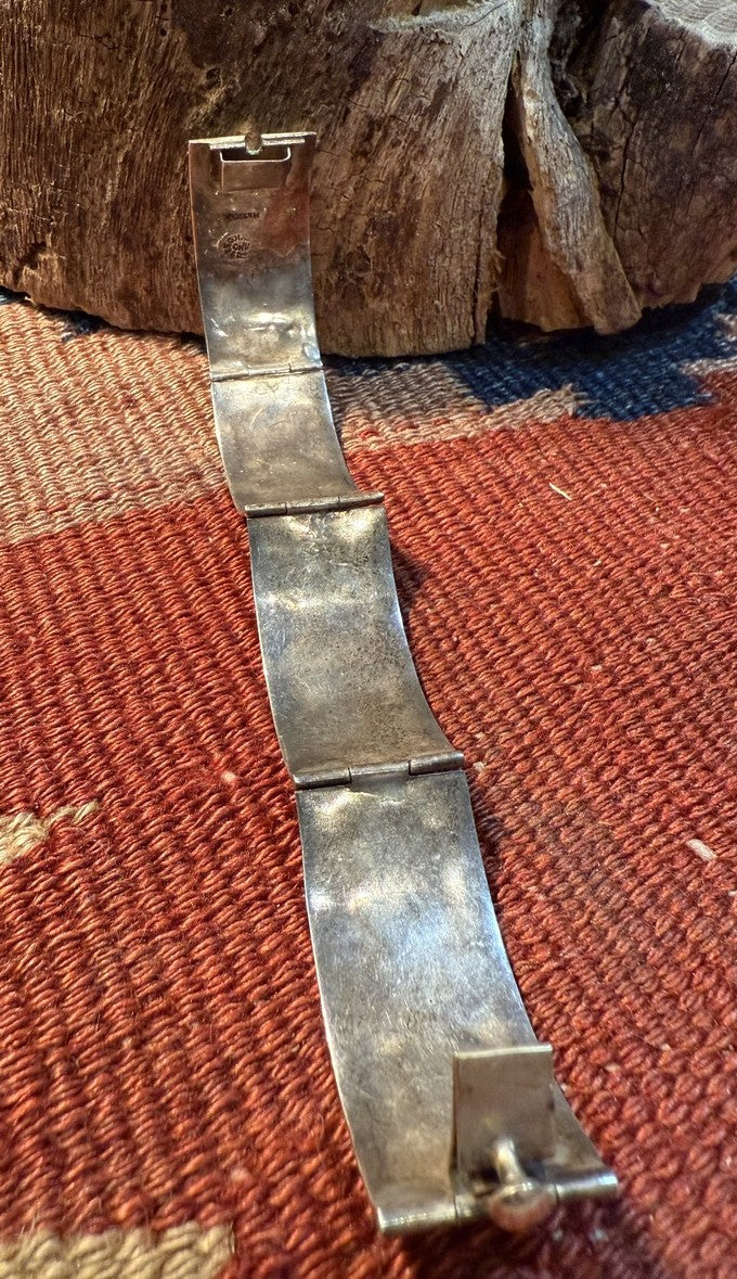 Four-hinge silver chip inlay cuff. Turquoise snake eyes are inlaid around a cross motif. It is inlaid with green turquoise. Original dark patina. Eagle 3. Mark Mexico 925.