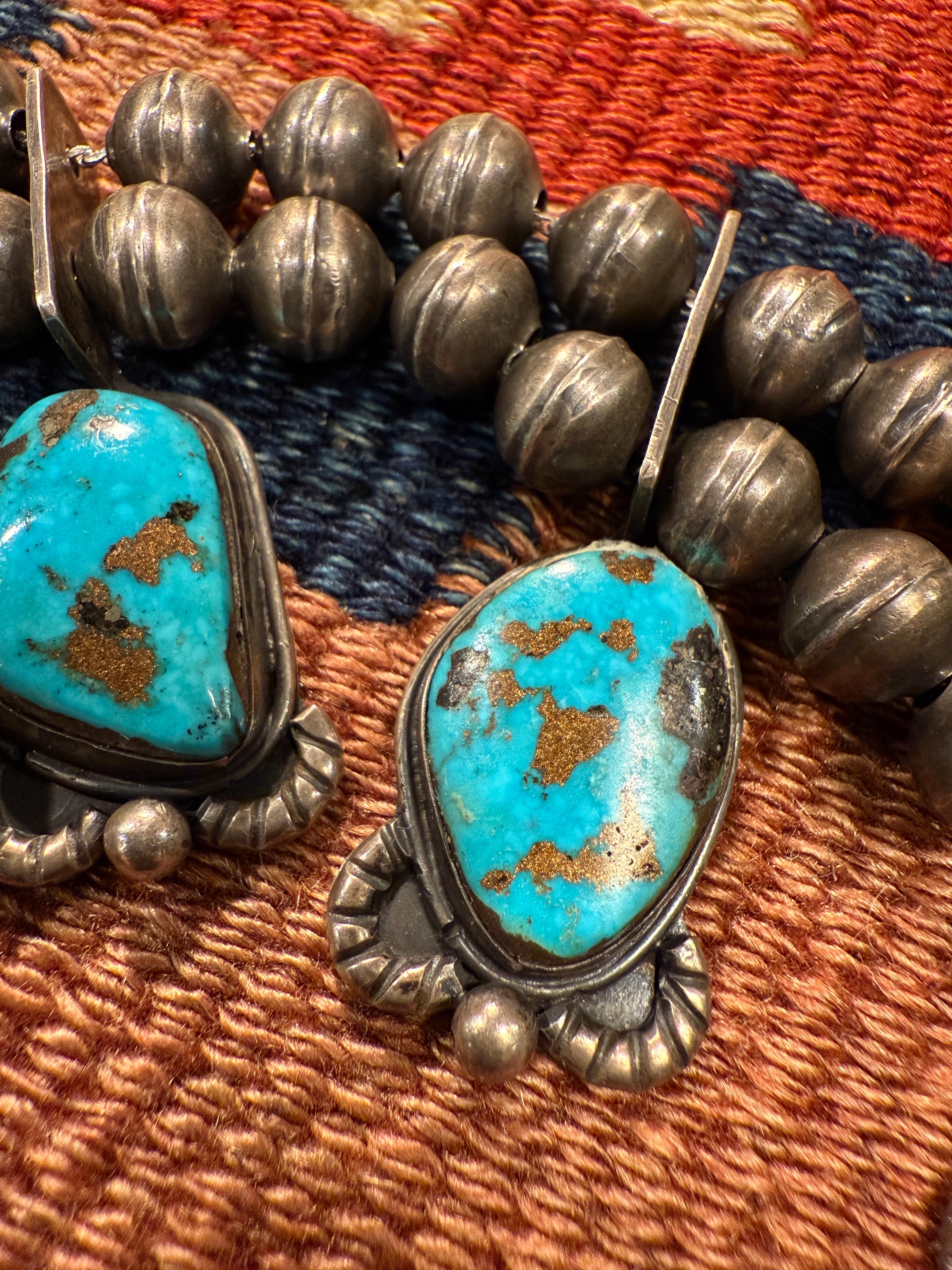 Every facet of this early squash blossom necklace cements its status as a tribal masterpiece. The stones natural gem turquoise from the Morenci mine located in southern Arizona. The settings were crafted around the natural stone shapes found with two hand-cut in Naja.