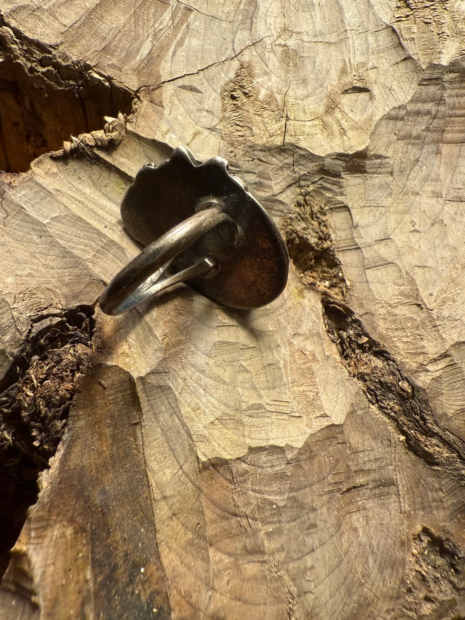 Old pawn turquoise ring with a bold oval stone and natural matrix. Finished with a fine bezel setting and a split shank band.