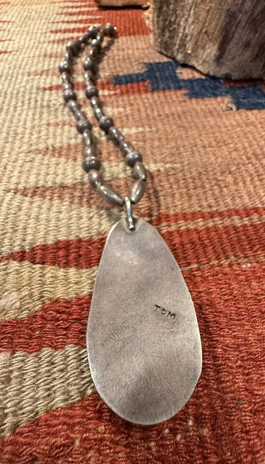 Morenci turquoise and Mediterranean coral cabochon set in a serrated bezel, within an oval silver shadow box pendant. The round, bench-made beads, along with oval pinion beads, show a nice old patina. Strung on a silver fox tail necklace, Mark TCM.