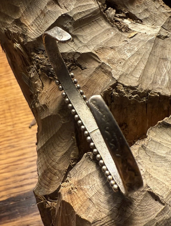 20 stone needlepoint turquoise deep-stamped bangle. Fine serrated bezel, silver raindrops on both ends. Old patina.