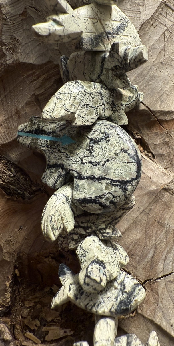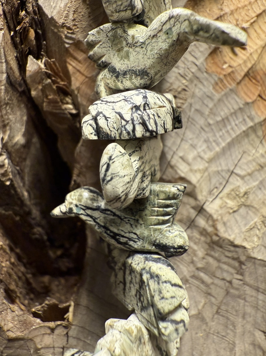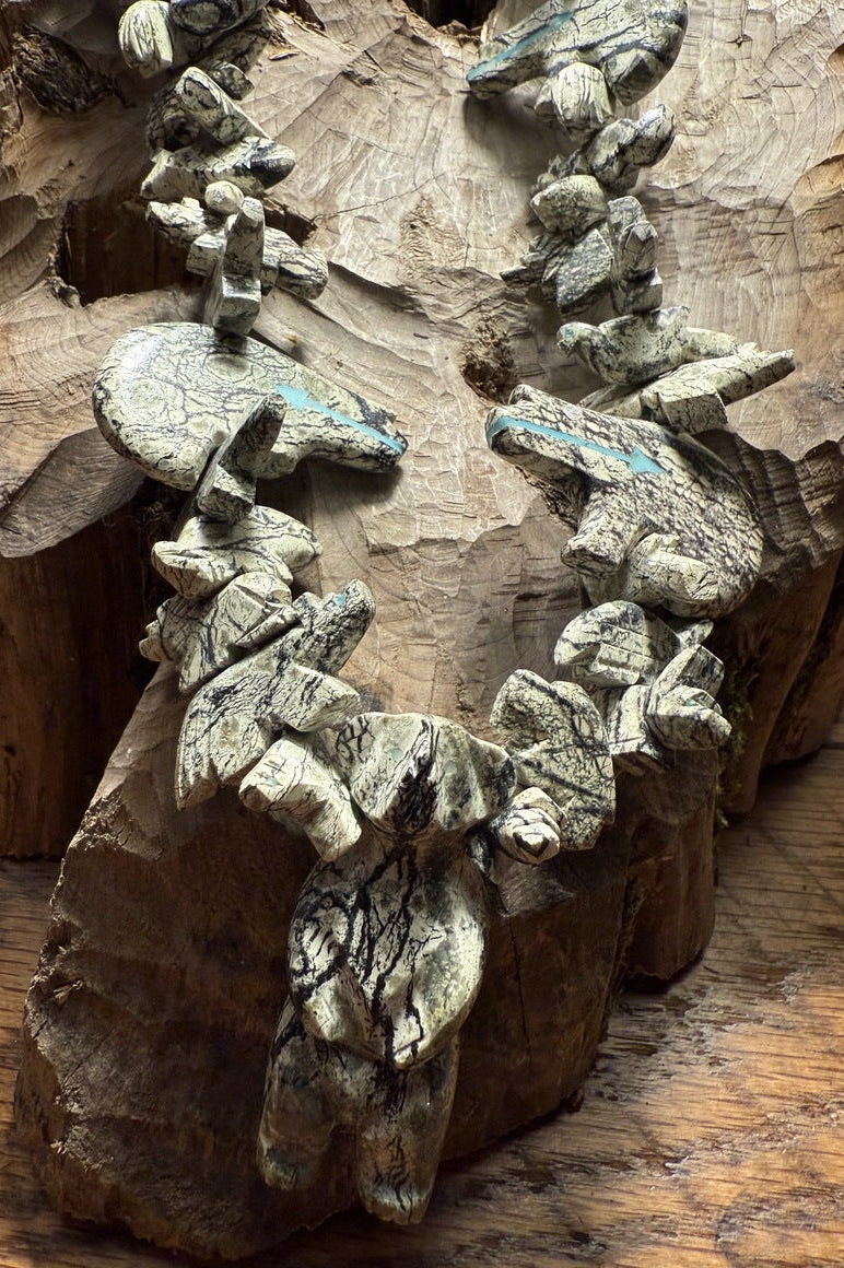 Strung on a Zuni Squaw Wrap fetish necklace. 50 hand-carved birds, fish, small mammals, spirits, and grizzly bears.