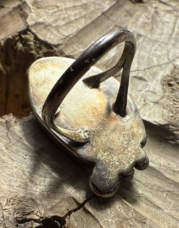 High-grade blue gem mine turquoise set in a superb hand-cut, serrated bezel, which is hand-stamped with sun's rays or a spoke wagon wheel shadow box edge on one side, which flows to raindrops. Old pawn. Original patina.