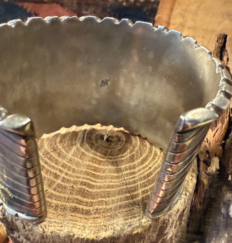 Massive 12 turquoise stones set in a hand-cut scalloped bezel. Six hand-stamped leaves taper to the rear gap. Deep hand-cut toothing accentuates the impressive turquoise above and below. A stamped mark is present, not identifiable, Zuni? Original patina.
