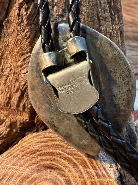 A superb pendant with an emerald green glass surface, a turquoise cabochon. Verigated host rock matrix, all over. A small patch of luminous blue suspended below the surface. Hand-cut scalloped bezel bracketed by thick, deep stamped silver bars. Deeply stamped paw print ends with 2 large raindrops. Silver patina is dark and original Bennett tie clasp. Dates from mid 50s. Marked ND made sterling.
