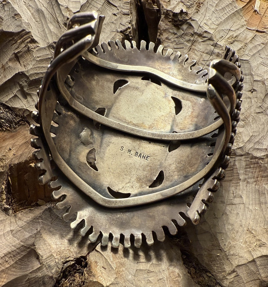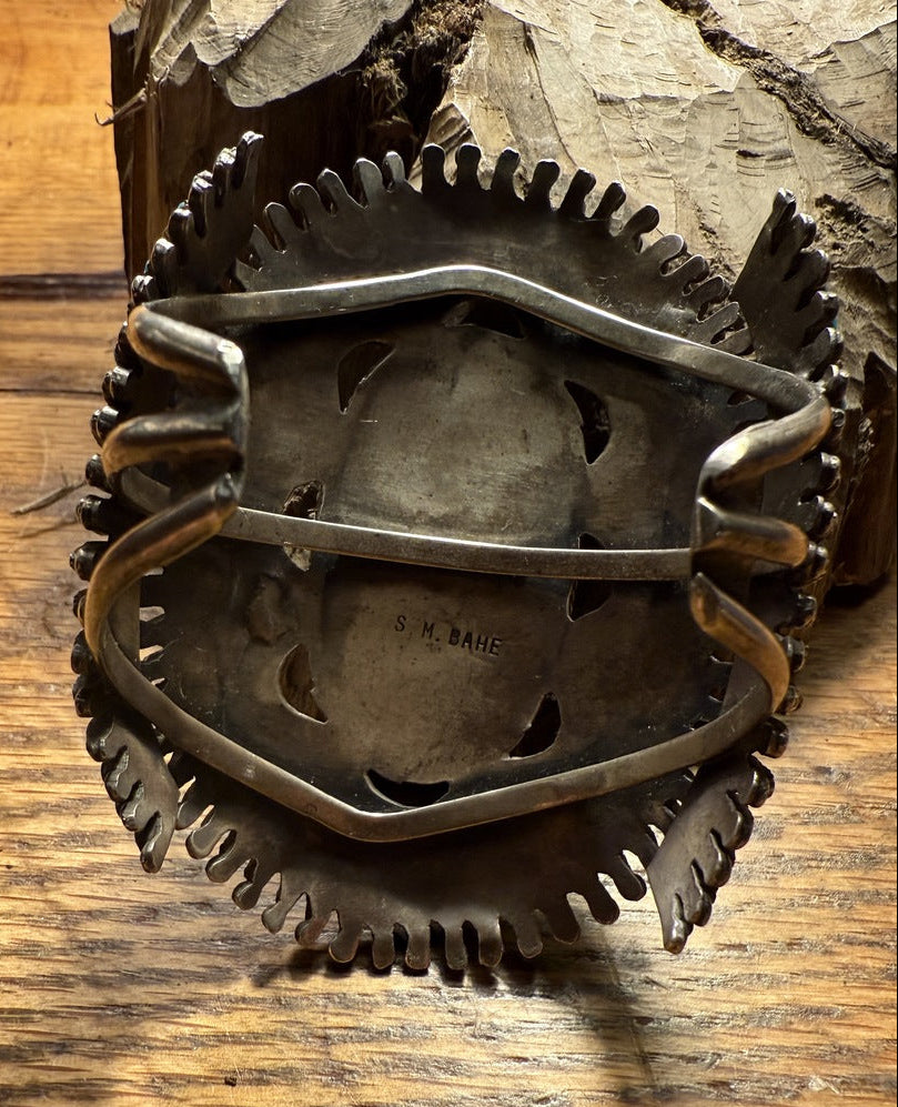 Vintage Turquoise and Silver Bracelet Hallmarked by S.M. BAHE. Fine details and silver work with needlepoint hand-cut Blue Gem turquoise. 131 set in a fine serrated bezel. Original patina. Mark S.M. BAHE